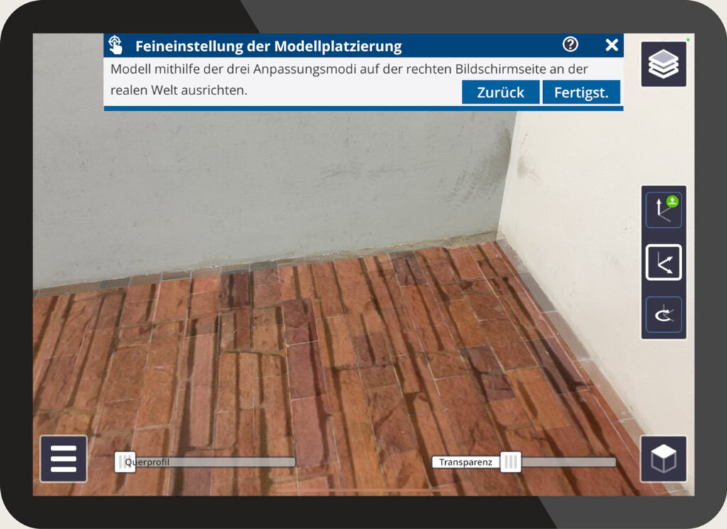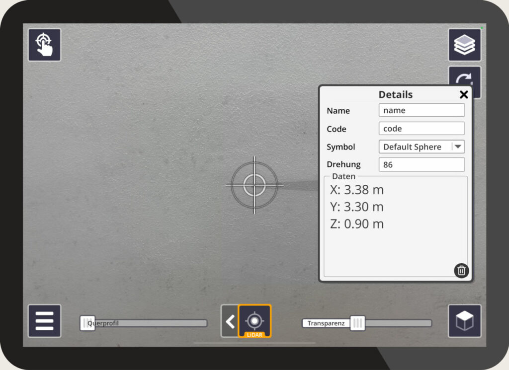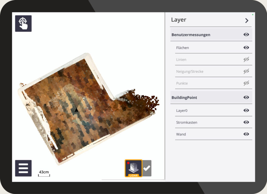 Mittels unterschiedlicher Messwerkzeuge lassen sich Koordinaten, Abstände, Neigungen, Längen und Flächen direkt durch Anzielen und Auswählen einzelner Punkte mit dem Fadenkreuz anzeigen. Sofern im Vorfeld eine Punktwolke mittels LiDAR-Scanner erfasst wurde, kann diese ausgewählt und für die Messungen herangezogen werden, um noch präzisere Ergebnisse zu erhalten. Andernfalls referenzieren die Werkzeuge automatisch das zugrundeliegende und in die Umgebung eingepasste 3D Modell für alle Berechnungen.
