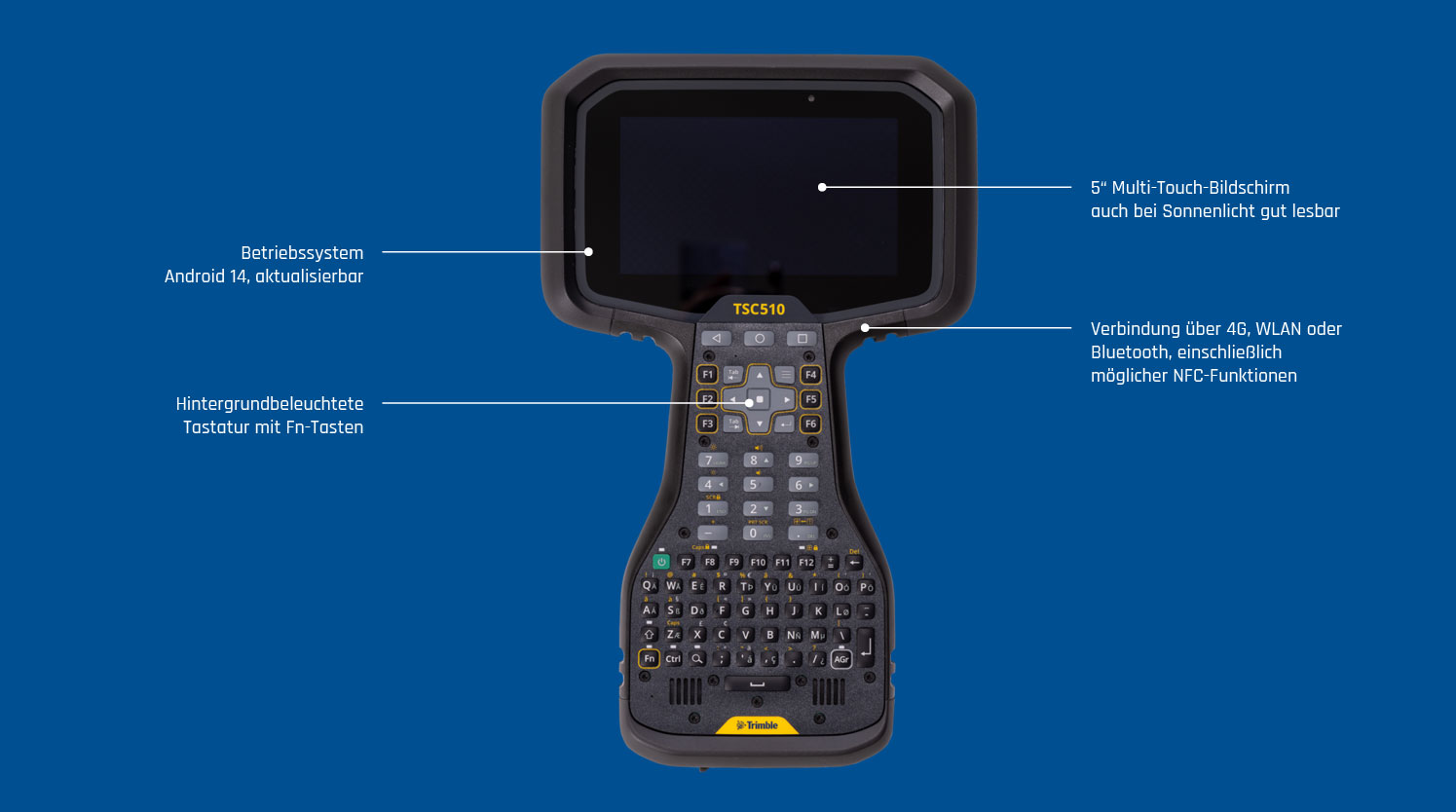 Der Feldrechner Trimble TSC510 ist zuverlässiger Partner, der durch seine Funktionalität, Robustheit, Zweckmäßigkeit sowie Performance sicherstellt, dass der Arbeitstag reibungslos, ohne Unterbrechungen oder Datenverluste verläuft. Er verfügt über eine vollständige, auch mit Handschuhen bedienbare Tastatur, basiert auf einem Android-14-Betriebssystem und einen 5“ großen Bildschirm, seine Akkuleistung reicht für einen ganzen Arbeitstag im Feld. Der TSC510 verfügt über einen schnellen Prozessor, große Speicherkapazität, einen hervorragenden Schutzstatus (IP68) und den Komfort von Android Quick Share. So wird die Arbeit mit komplexen Daten und die Verwaltung von Projekten schneller, effizienter und zuverlässiger als je zuvor.