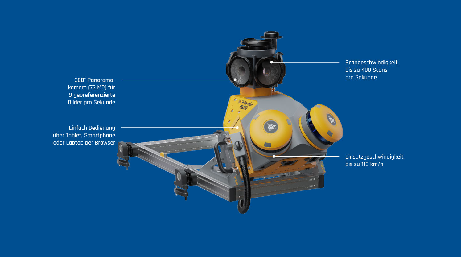 - Das Trimble MX60 Pro System ist ideal für die Straßenüberwachung und Gewährleistung der Sicherheit durch bspw. Identifizierung kleinster Details wie Risse im Straßenbelag